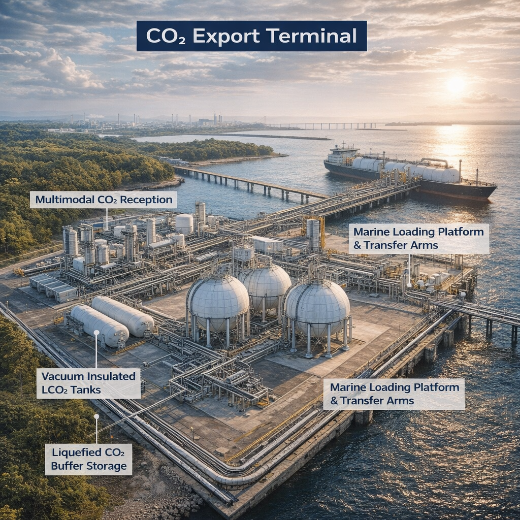 Notre approche va au-delà du stockage seul : elle vise la réalisation de chaînes terminales cohérentes, depuis le hub de collecte jusqu’aux interfaces d’export. Selon le périmètre confié, Entrepose Contracting peut intégrer les installations de réception, la préparation du CO₂, le stockage intermédiaire et les équipements associés nécessaires à l’exploitation du terminal. Cette logique est cohérente avec les architectures aujourd’hui développées pour les hubs et terminaux CO₂, qui associent collecte, liquéfaction, stockage tampon et chargement maritime.
