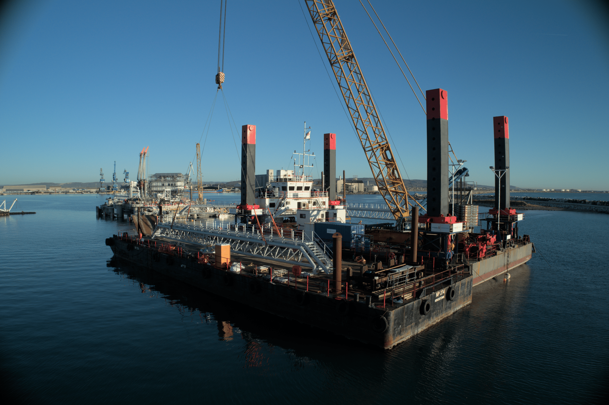 - Travaux maritimes & dragage : Réalisation d’un dragage d’environ 800 000 m3 et construction de deux plateformes de jetée sur pieux acier avec douze ducs-d’Albe et équipements d’accostage, en maintenant les trafics du port de Sète–Frontignan.